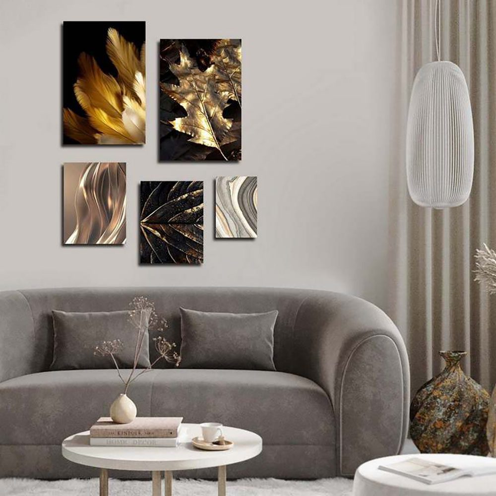 تابلو شاسی 5 تکه طرح مدرن ورق طلا برگ و پر کد 30379