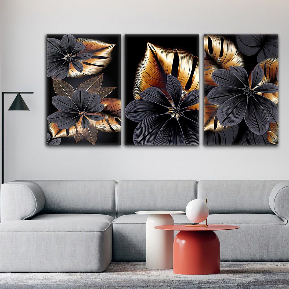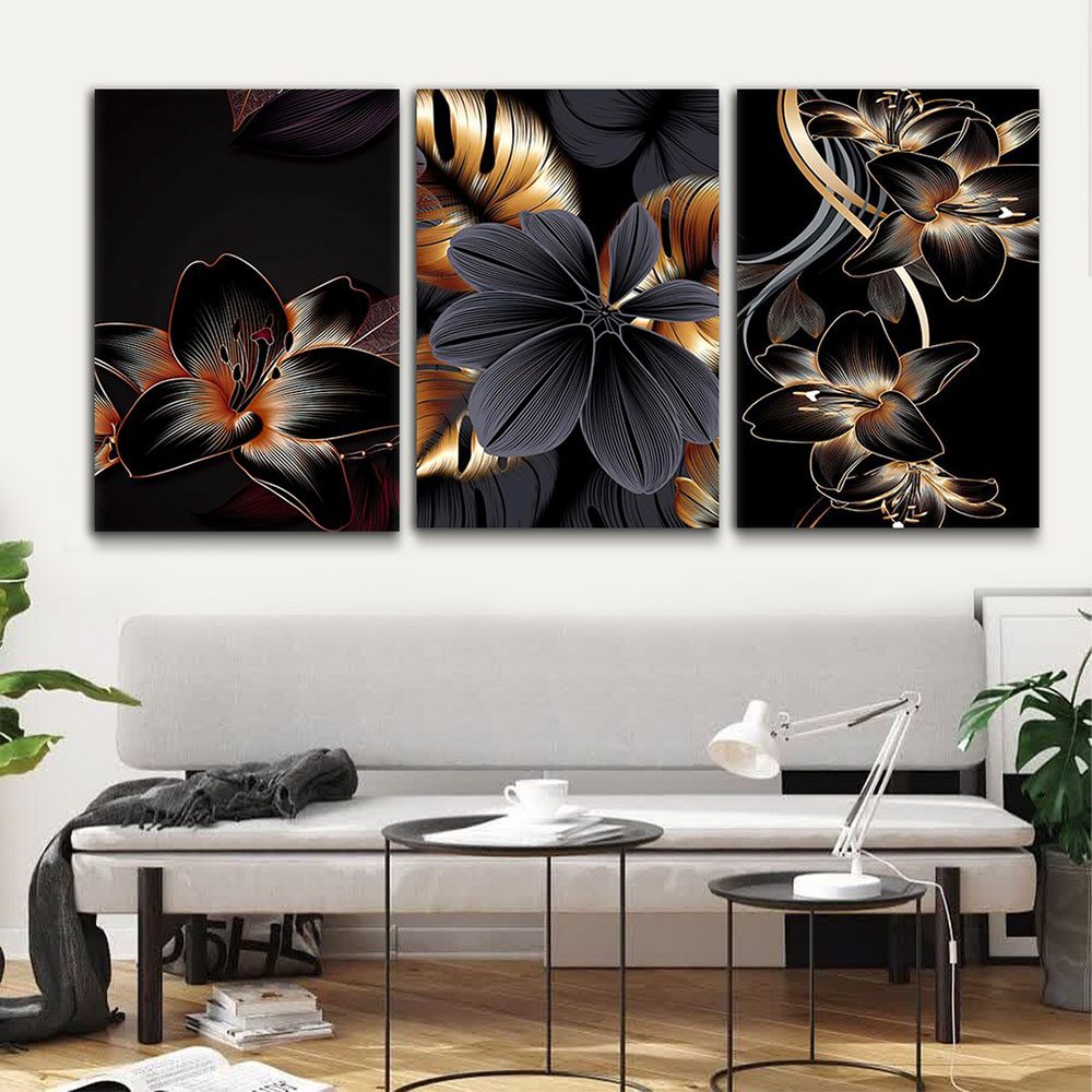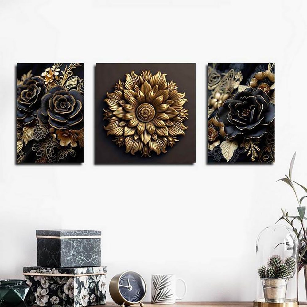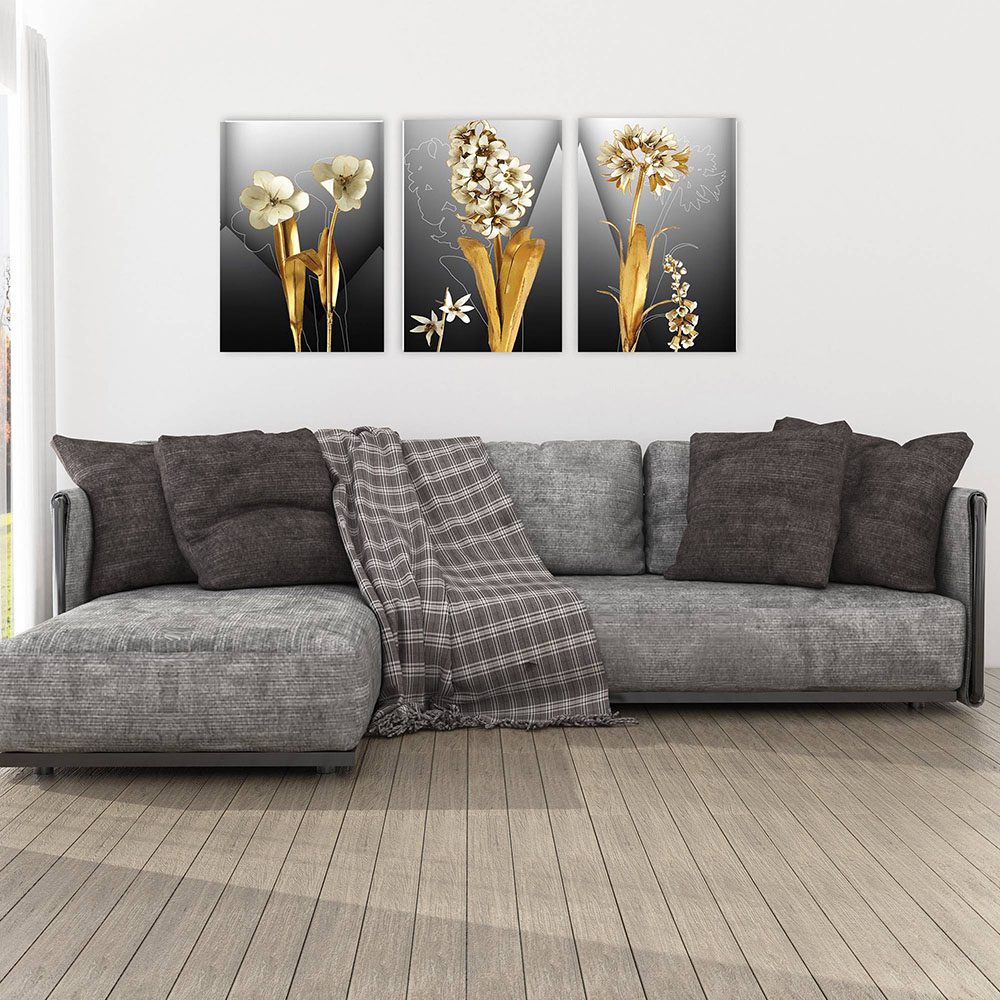 تابلو شاسی 3 تکه طرح دکوری مدرن گل طلایی و فشن استایل کد 65296