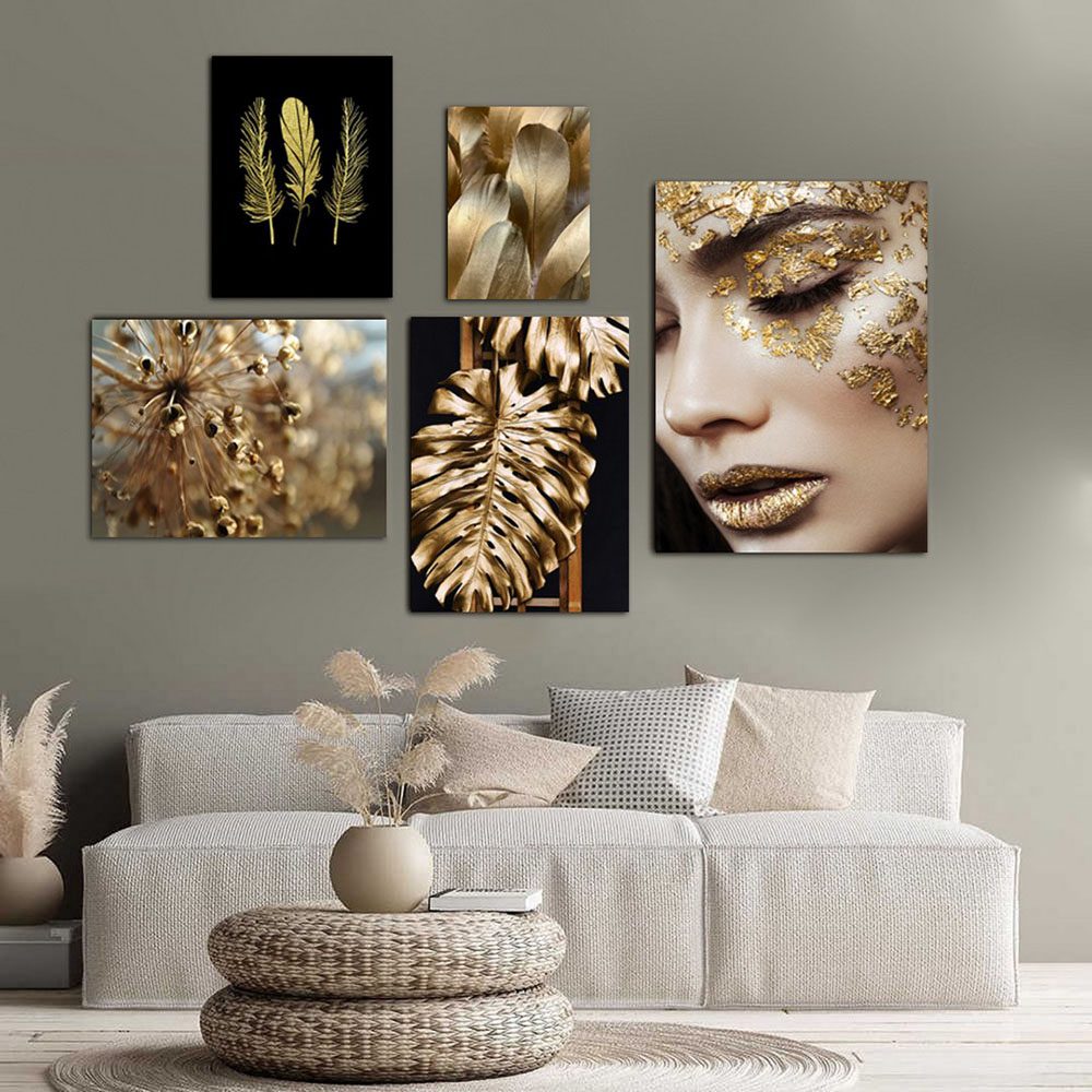 تابلو شاسی 5 تکه طرح چهره و برگ طلایی کد 42953