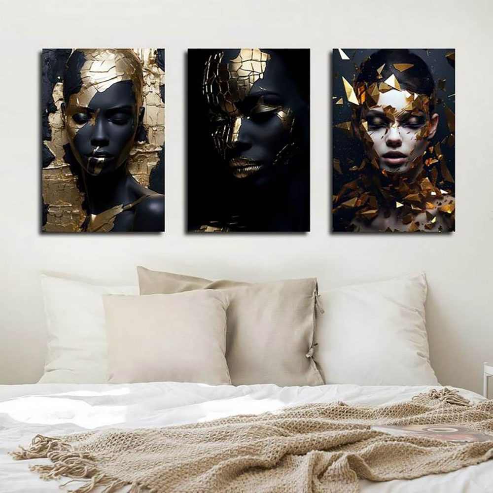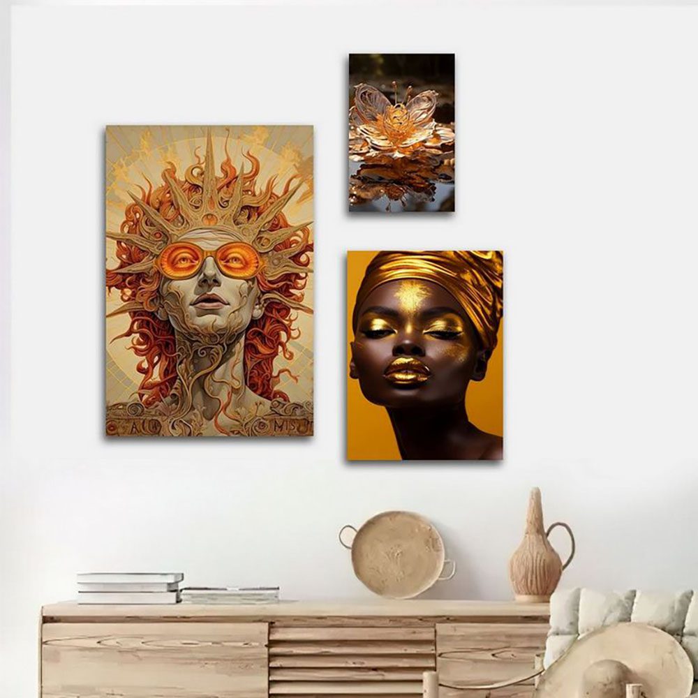 تابلو شاسی 3 تکه طرح مدرن چهره زن آفریقایی و گل طلایی کد 59735