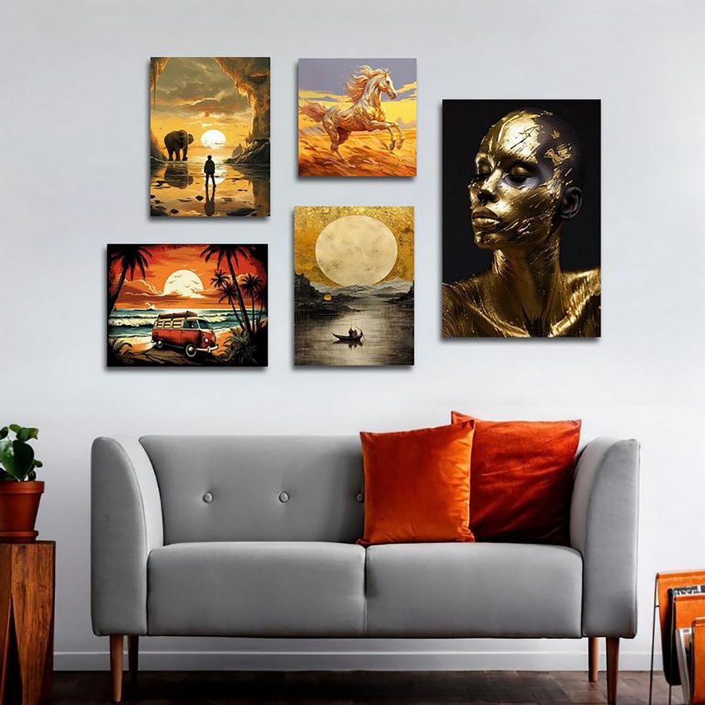 تابلو شاسی 5 تکه طرح غروب و چهره و اسب طلایی کد 23947