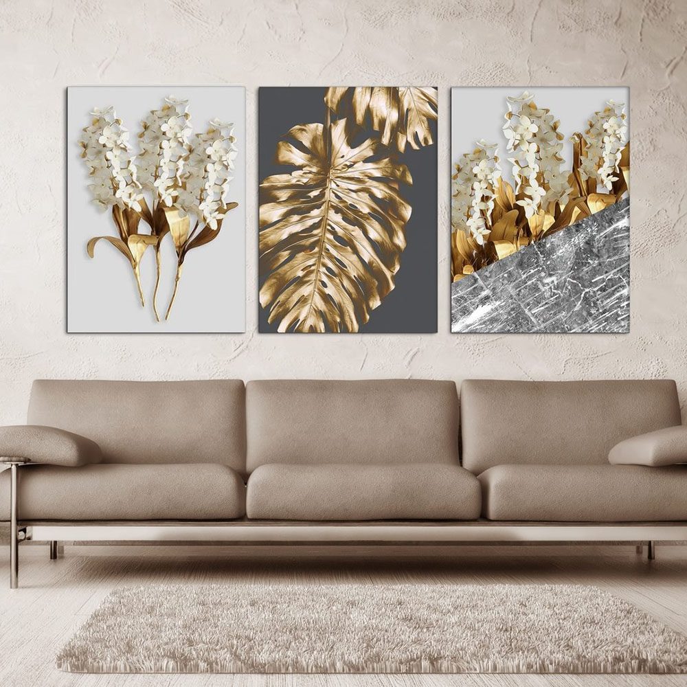 تابلو شاسی 3 تکه طرح دکوراتیو گل و برگ طلایی کد 86484