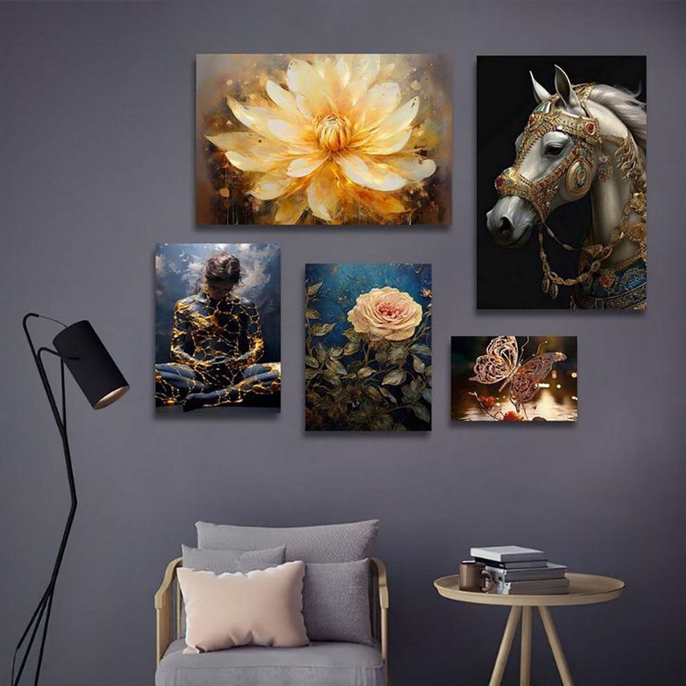 تابلو شاسی 5 تکه طرح اسب و گل و پروانه طلایی کد 40007