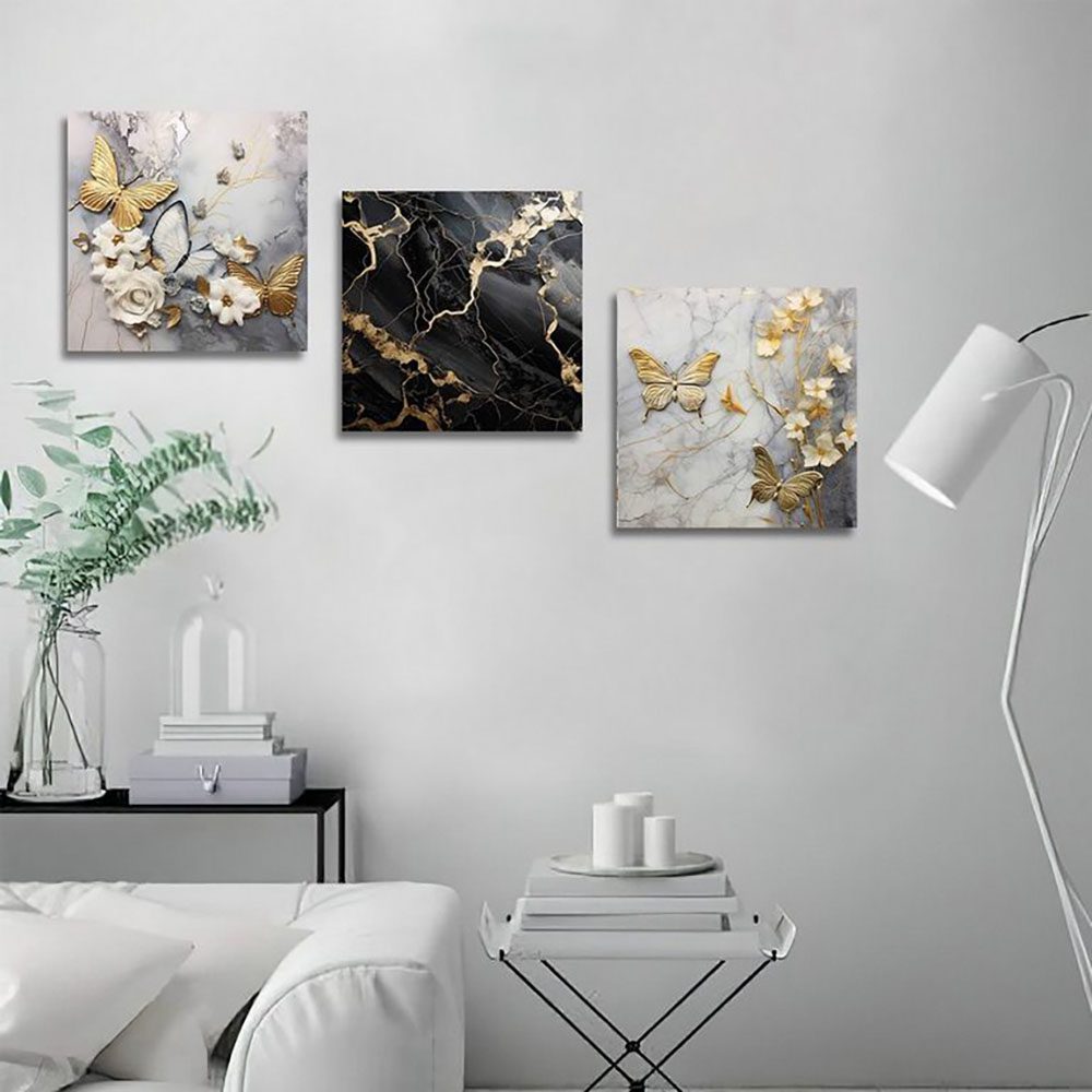 تابلو شاسی 3 تکه طرح رزین گل و پروانه طلایی کد 94696