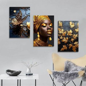 تابلو شاسی 3 تکه طرح دکوراتیو چهره آفریقایی طلایی کد 22280