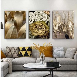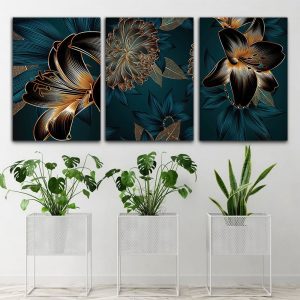 تابلو شاسی 3 تکه طرح دکوراتیو گل و برگ طلایی کد 86484
