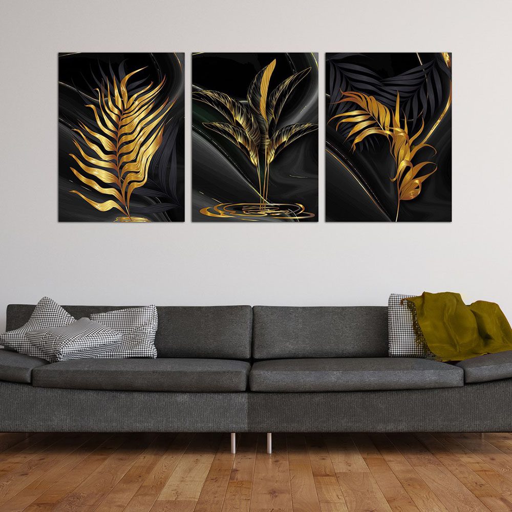 تابلو شاسی 3 تکه طرح دکوری مدرن گل طلایی و فشن استایل کد 65296