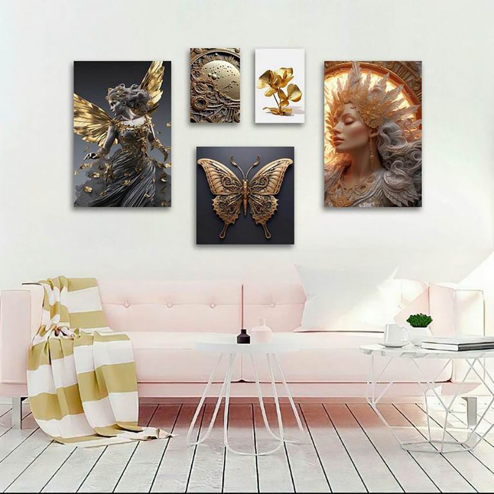 تابلو شاسی 5 تکه طرح چهره و گل و پروانه طلایی کد 34957