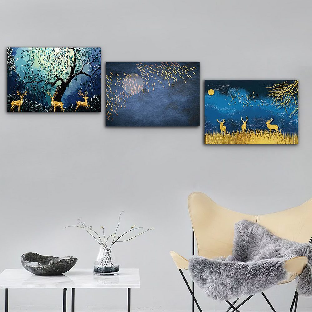 تابلو شاسی 3 تکه طرح گوزن و مهتاب طلایی کد 39451