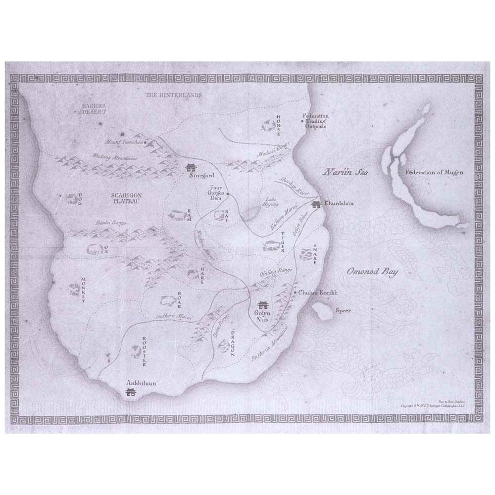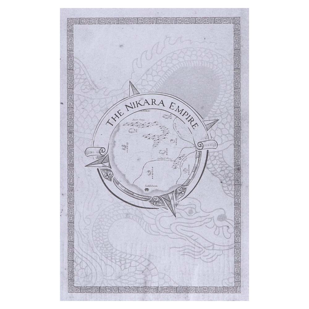 از نظر فیزیکی، کتابهای این سهگانه معمولاً در قالب یک باکسست (مجموعهی جعبهای) شکیل عرضه میشوند که هر سه جلد را یکجا در بر دارد. نسخههای رایج این باکسست در قطع رقعی (Trade Paperback) با جلد نرم منتشر شدهاند که مجموعاً حدود ۱۸۷۲ صفحه را شامل میشود. جلدهای کتاب طراحی منحصربهفرد و چشمنوازی دارند که حالوهوای داستان را منعکس میکند: هر جلد دارای طرحی به سبک نقاشی墨 (جوهر چینی) است که تصویری از شخصیت اصلی یا نمادی اساطیری (مانند ققنوس آتشین یا اژدهای خروشان) را در پسزمینهای سفید به نمایش میگذارد. این طراحیهای مینیمال و در عین حال پرجزئیات، حس و حال شرقی و حماسی داستان را بهخوبی منتقل میکنند. برای مثال، روی جلد کتاب اول تصویر دختری کمانبهدست (رین) را میبینیم که چون شبحی در میان دود برخاسته از تریاک ظاهر شده؛ یا جلد کتاب دوم سایهی اژدهایی را نشان میدهد که یادآور عنوان آن است. چاپ و صحافی کتابها با کیفیت مناسب انجام شده تا خواننده بتواند این سفر طولانی و نفسگیر را بهراحتی همراهی کند.