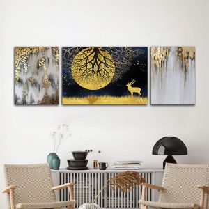 تابلو شاسی 3 تکه طرح گوزن و مهتاب طلایی کد 39451
