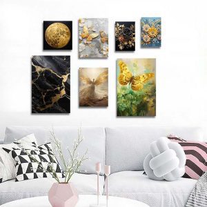 تابلو شاسی 7 تکه طرح دکوراتیو گل و پروانه طلایی کد 30969