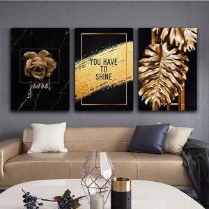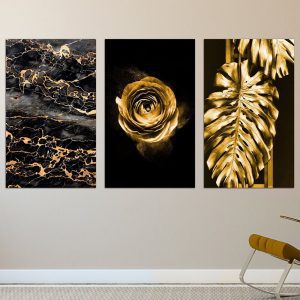 تابلو شاسی 3 تکه طرح برگ و گل طلایی کد 96474