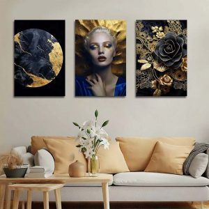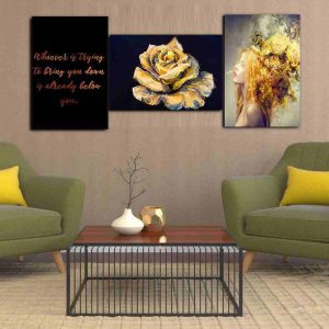 تابلو شاسی 3 تکه طرح چهره و گل طلایی کد 70637